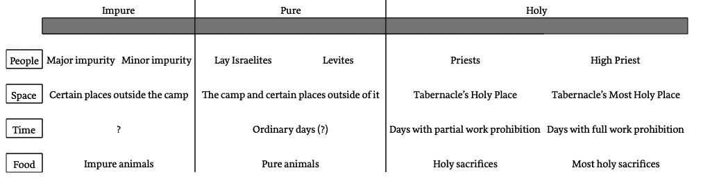 It may seem that a priestly perspective is most likely to differentiate between the sacred and the secular. The priests of Israel were to “distinguish between the holy [qodesh] and the common [chol], between the unclean [tame’] and the clean [tahor]” (Lev 10:10). Sklar summarises the range of ritual states in the Levitical law (see table below). Various people, places and times were holy, pure or impure. These were not moral states, but ritual states.